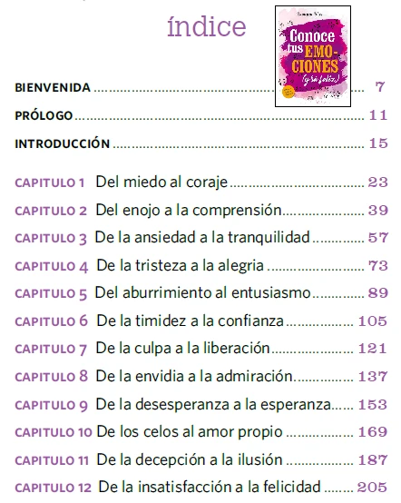 Culpa, alegría, tristeza, esperanza, celos, miedo Cambia las emociones que te bloquean y potencia las que te hacen feliz. Este libro propone el conocimiento y la transformación de las emociones negativas en positivas. Para esto, la autora no solo da un marco teórico con ejemplos concretos y con los que los lectores se sentirán identificados en su vida cotidiana, sino que además en cada capítulo propone ejercicios, visualizaciones, un nuevo modo de usar el lenguaje para expresar nuestras emociones y nuevas acciones que nos transporten hacia las emociones placenteras. Esto no solo hará que nos sintamos mejor con nosotros mismos, sino que también provocará un cambio favorable en nuestro entorno y nos dará una nueva manera eficaz y asertiva de expresar lo que sentimos y de sociabilizarnos.